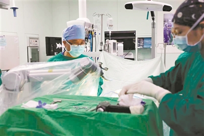 天玑”机器人上岗辅助手术。 (全媒体记者陈治家 通讯员薛珊、董飞摄影报道)近日,54岁的患者胡某不慎外伤致胸腰疼痛,经广东省中医院珠海医院诊断为腰2椎体骨折。1月6日,医院为胡某实施手术,首次采用“天玑”骨科手术机器人精准“操刀”辅助手术,手术获得圆满成功。 据悉,这次手术属珠海首例,这也是珠海首次引进“天玑”骨科手术机器人,该机器人能够完成脊柱、创伤等骨科手术,实现亚毫米级手术精度。省中医珠海医院的专业团队与高精尖设备强强联合,实现了骨科手术的微创化、精准化、智能化。 “广东省中医院珠海医院的骨伤科,是珠海规模最大、实力最强的骨伤中心、脊柱微创中心,为骨科手术机器人落户珠海打下了坚实基础。”1月6日,在广东省中医院珠海医院骨科手术机器人项目启动仪式上,珠海市卫生健康局副处职领导陈巧梧在致辞中表示,他还强调此次骨科机器人落户珠海,投入临床应用是医疗领域新技术革命的典型代表,具有高度的战略性、成长性和带动性。启动仪式上与会嘉宾相继为骨科手术机器人揭幕,并见证骨科手术机器人临床应用示范基地授牌这一重要时刻。 随后,活动现场进行首例骨科手术机器人“上岗”直播,省中医珠海医院骨二科(脊柱科)陈茂水主任为患者胡某实施手术,在骨科手术机器人精准定位辅助下,成功完成了珠海市第一台骨科手术机器人辅助下的经皮微创腰椎内固定手术,减少手术费用和创伤,手术历时一个小时,获得圆满成功。 “我们医院一直注重继承和发扬岭南骨伤科流派精髓,吸纳高新技术,通过骨科手术机器人的辅助,相信可以让我们的骨科得到更高发展、更大进步。骨科机器人辅助手术相当于手术医生多了一双通过皮肤就能够看到人体深部骨组织的有穿透能力的‘眼睛’和精确到亚毫米级别的‘手’。”在媒体采访中,广东省中医院副院长刘军介绍了骨科手术机器人的优势。 “省中医珠海医院骨科成为‘天玑’手术机器人临床应用示范基地,将为大湾区骨科医生学习前沿科技及智能骨科领域的研究提供良好平台和机会,助力大湾区骨科学术影响力不断增强。” 据了解,此次省中医珠海医院引进的骨科手术机器人,是我国自主研发的具有完全自主知识产权的“天玑”骨科手术机器人,也是目前国际上唯一既能开展脊柱,又能开展创伤的骨科手术机器人。曾经在2018年首届中国国际进口博览会上,作为中国馆七件展品中的唯一一件医疗领域代表,向世人展示中国的高精尖技术。 作为骨科医生的“得力助手”,骨科手术机器人让经验丰富的医生如虎添翼。手术的规划和决策取决于医生的判断,但是骨科手术机器人可以精准透视到骨骼组织,机械臂可以精准到达指定位置,实现高难手术安全化、微创手术常规化、关键操作智能化。
