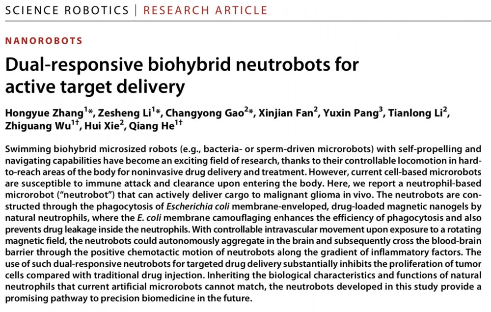 常规的药物递送手段,比如打针或者吃药等方法,都是药物分子或药物载体在血液或其他生物流体中扩散完成的,这会导致药物在病患区域的有效剂量低,而且毒副作用大。”近日,哈尔滨工业大学微纳米技术研究中心贺强与吴志光教授在接受澎湃新闻(www.thepaper.cn)记者专访时表示,为解决上述问题,他们致力于开发能够进行自主运动的游动微纳米机器人。贺强率领的研究团队近期在《科学机器人》(Science Robotics)上在线发表了一项在微纳机器人领域备受关注的研究,该研究题为“双响应生物杂化中性粒细胞机器人用于主动靶向递送”(Dual-responsive biohybrid neutrobots for active target delivery),他们首次实现了游动微纳米机器人对脑胶质瘤的主动靶向治疗。